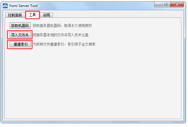 优米云盘1.6.3版本发布了几个新功能,这里我们讲一下服务器端控制台,工具选项栏中,文件导入与重建索引两个功能。