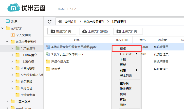 双击文件默认是对文件进行预览,当用户仅有预览权限的时候,系统会调用预览控件预览文件;当用户有下载权限时,默认调用本地程序打开对应格式的文件进行预览,这样主要是为了方便用户对于一些特殊格式的文件的预览操作。客户端右上角下拉菜单“设置”中可以选择默认的预览方式。