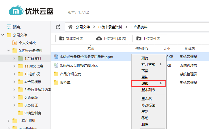 用户在客户端中编辑文件,首先需要有下载权限,并且必须使用右键菜单的编辑按钮,对文件进行编辑,点击编辑按钮,客户端会调用本地程序打开对应格式的文件,并且弹出一个小的置顶的编辑对话框;用户编辑结束并保存文件后,可以在编辑对话框中填写文件版本描述,点击完成编辑,这时会自动更新文件版本。