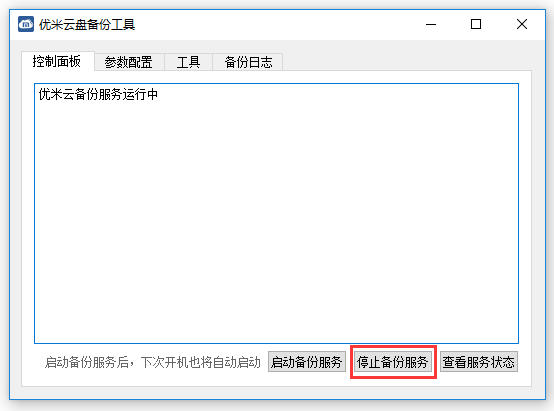 2.2在备份工具-控制面板首页,点击“停止备份服务”,关闭备份服务;